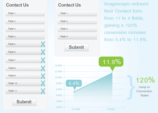 Let’s face it – spending time on filling a form is no fun. Your website visitors are likely to abandon the form when they are bombarded with too many questions. Stick to the basic contact information questions you require for future communication. Imagescape reported a 120% rise in conversion rate when they reduced their contact form fields from 11 to 4. Formstack’s 2015 Form Conversion report showed a 189% conversion rate increase when form users could pull data from their social data profile rather than manually typing it.