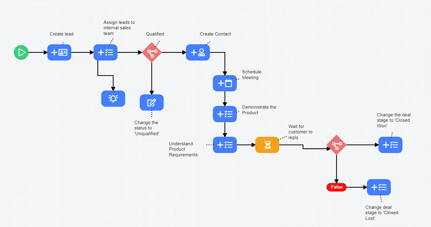 Tasks include scheduling a meeting, demonstrating a product, understanding product requirements, and waiting time after negotiation discussion. Every task can be added to the process designer and let the CRM do its magic.