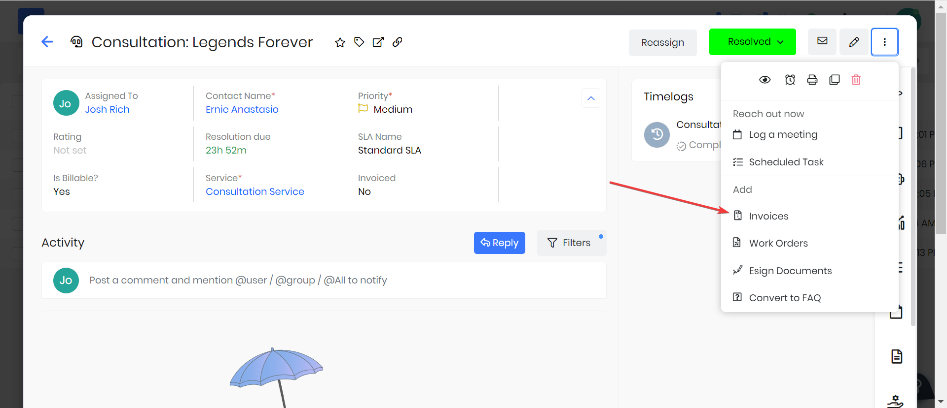 Once the record has been set as Closed or Resolved, you can then create an invoice from the record. This invoice will pull in the information directly from the timelogs set as billable based on the rate set within the record.
