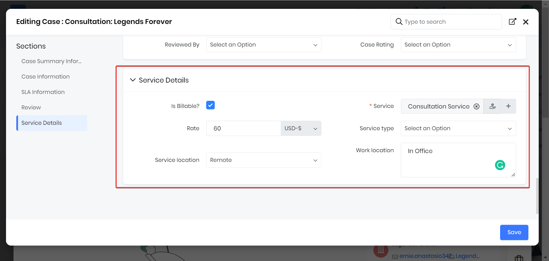 From there, a team member will begin working on the request for consultation, which often includes multiple meetings with the client alongside additional internal work with other departments. Knowing that the request was for consultation, the user would first set the record as billable and link the related service.