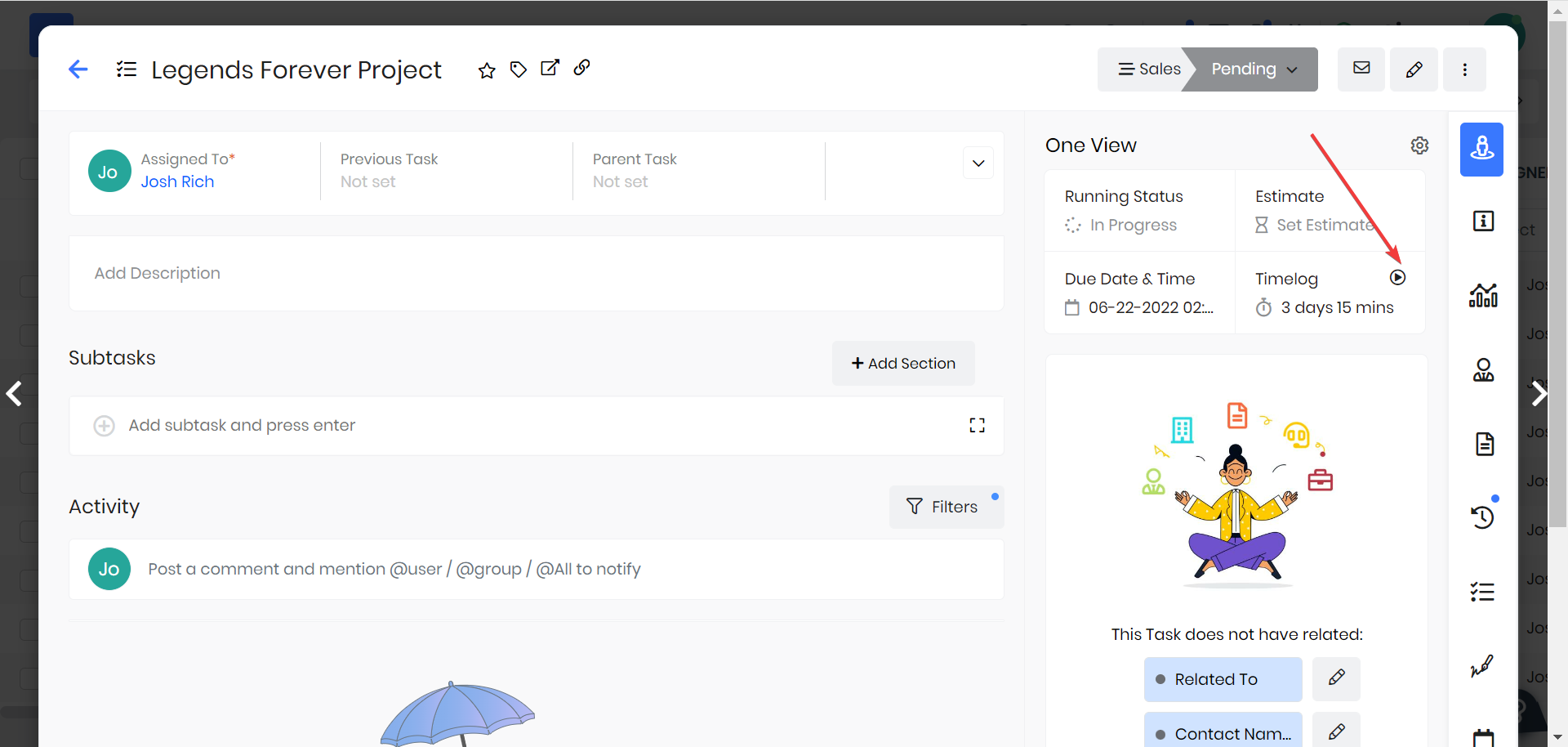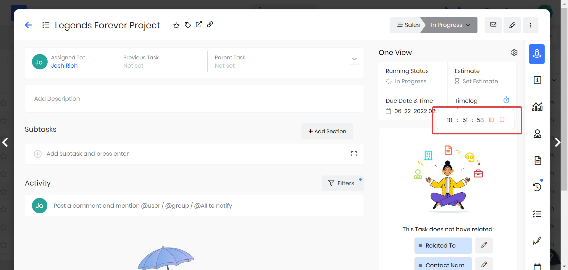 Timelogs allow you to document your time spent on specific tasks. The module gives you the option to select the starting Time and Date and End Time and Date of the activity and add additional details as needed.