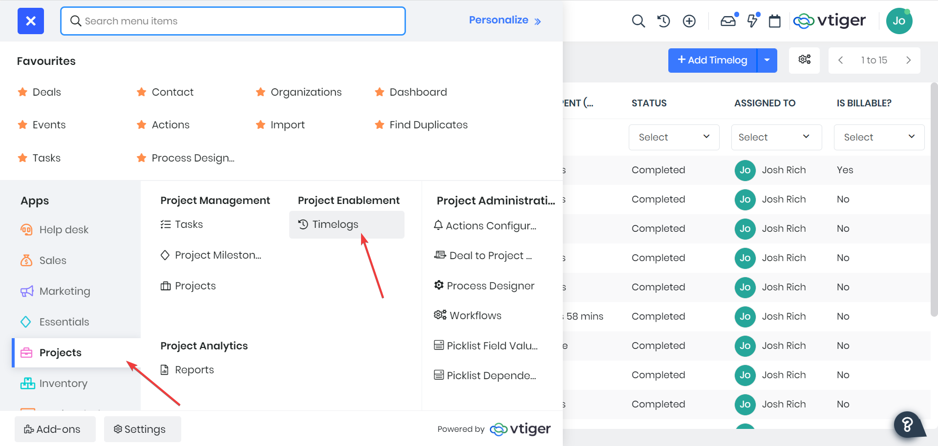You can also create the timelogs in two other locations: The Timelogs module and the Quick Create menu.