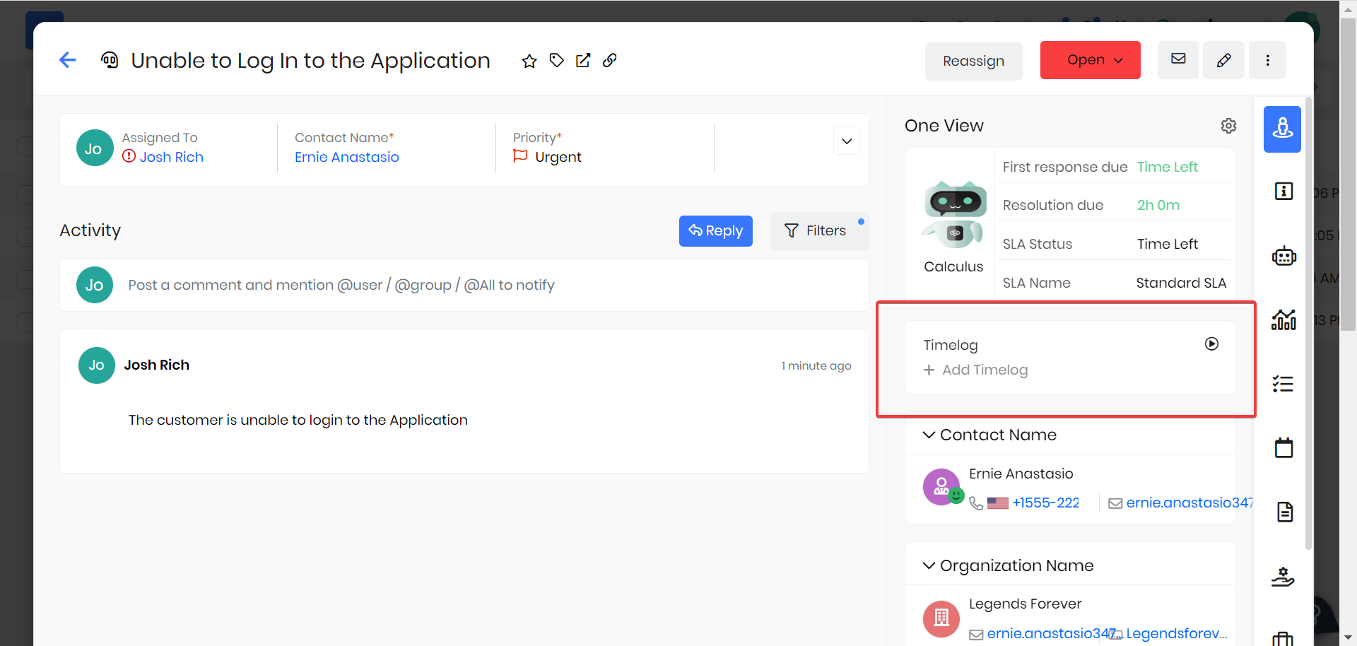 The timelogs are available in Tasks, Cases, Internal Tickets, and Work Orders. You can find the timelogs in the One View section of each record, as shown below.