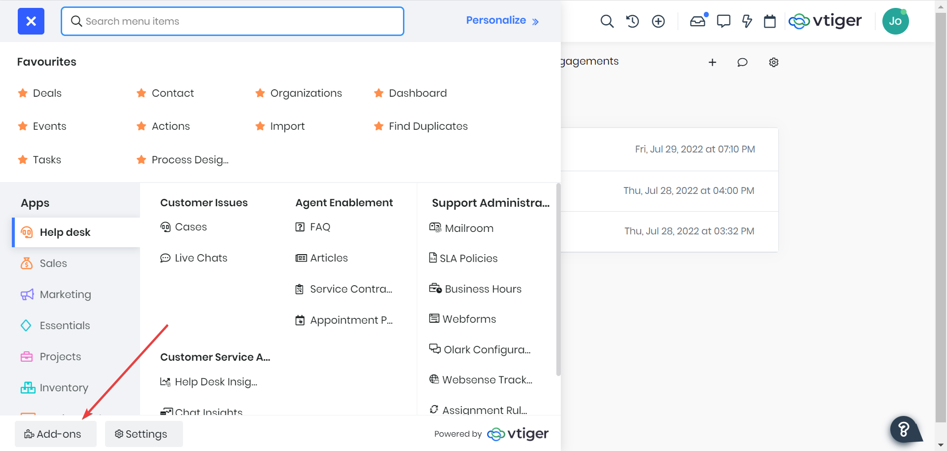 The Viewers Add-On is available on the Add-Ons page of the CRM. To access the page, go into the menu within the CRM. In the menu, you should see the Add-Ons button at the bottom-left-hand corner.