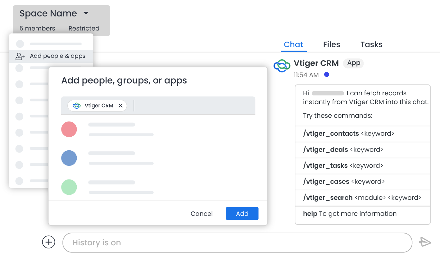 If you want to update details about the customer in the team group (Spaces), you can add Vtiger Bot to the group and fetch information by giving commands accordingly. This allows you to update your team on the go without messaging everyone individually.