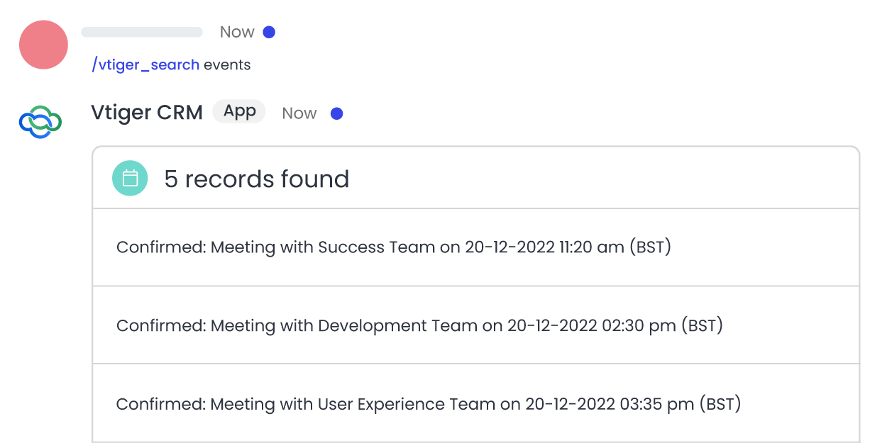 - Reduced cross-team dependency: By being able to chat individually with Vtiger Bot, you will be able to minimize depending on other teams for information. With various commands, you can access customer or task details from the chat itself and focus on completing your activities before the deadline.