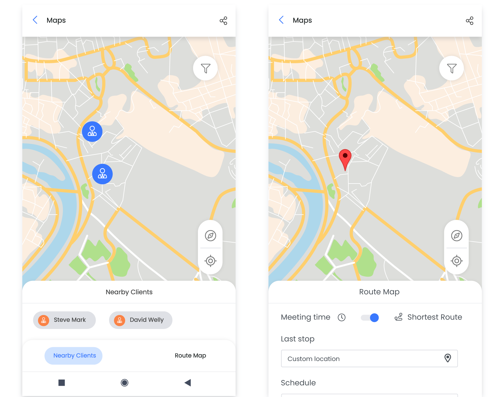 • Find new leads nearby using the Nearby Clients feature. By using the filter option, you can check how far they are located from your current location using route mapping.