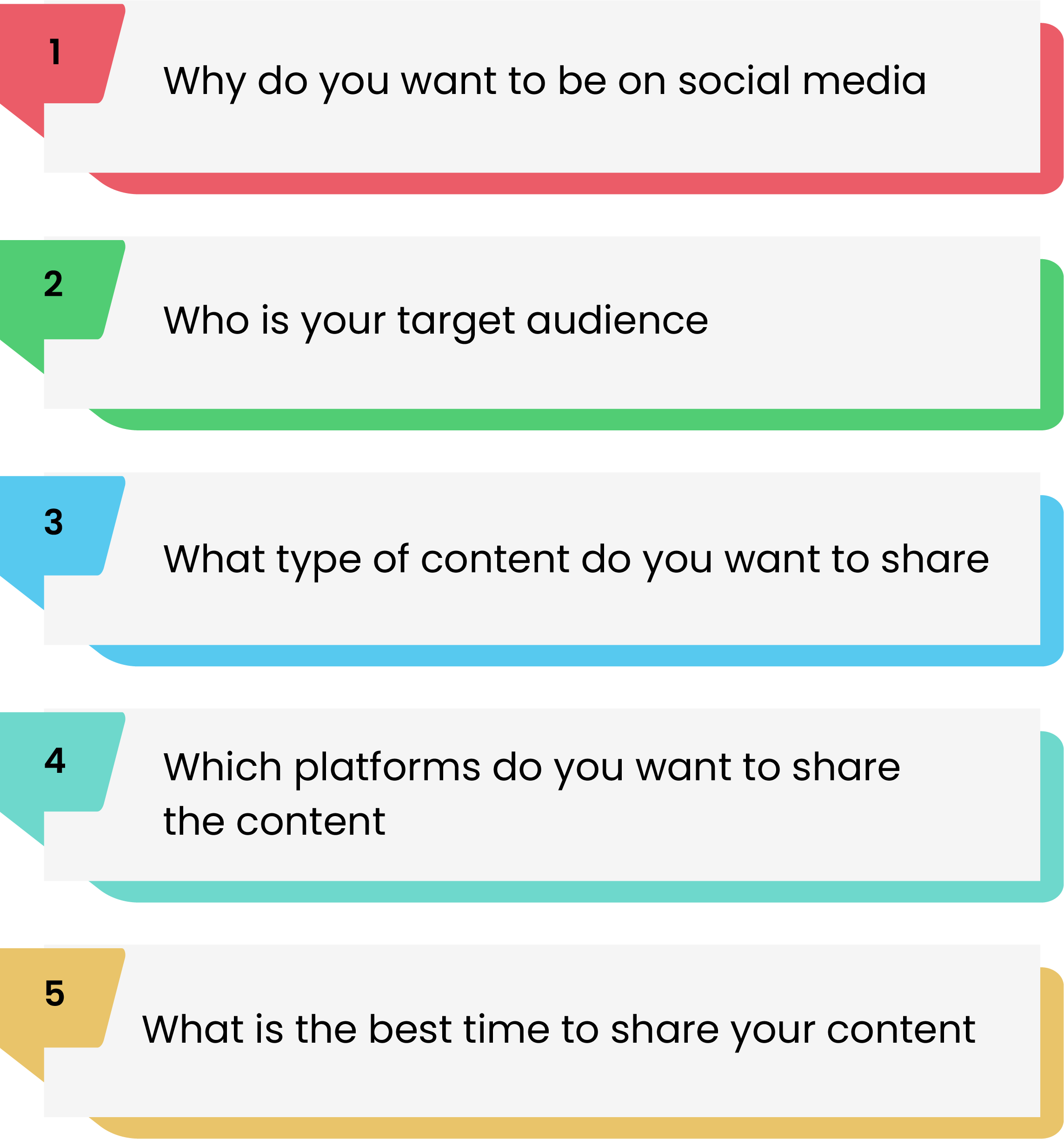 • First, you should jot down your social media goals. Your reasons to be on social media can be to drive traffic, increase business revenue, improve customer engagement, enhance brand loyalty, etc. A clear-cut goal will help you attain your objective without any buffer.
