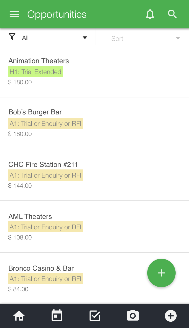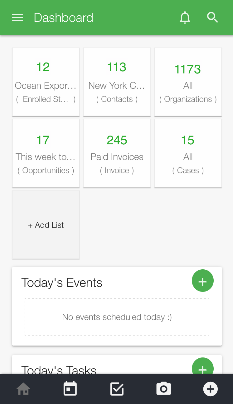 The second area is a list of Today’s upcoming activities and tasks. This one is pretty self explanatory. For all of the events and tasks related to your contacts, opportunities, or sync-ed across from Outlook, Google Calendar, or other calendar systems you use, the Vtiger mobile app will automatically surface what’s relevant to you today.