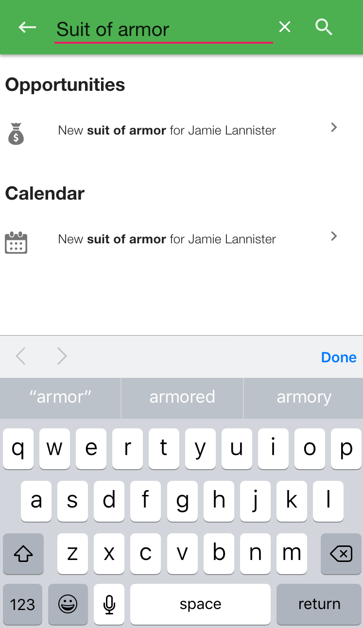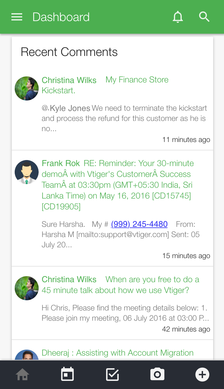 Then comes the traditional mobile app functionality you’d expect from a mobile CRM app. Search in Vtiger’s mobile app is extremely simple to use, but powerful. It leaves no stone unturned and searches across every field and every record for the string you’ve entered – including comments. So, say you’re searching for “Bob Smith”, type it into the search bar and Bob’s related records will pop right up. If, however, you remember the words “best chance of winning” in a comment on a recent opportunity you worked on, then just type that in to surface the opportunity.