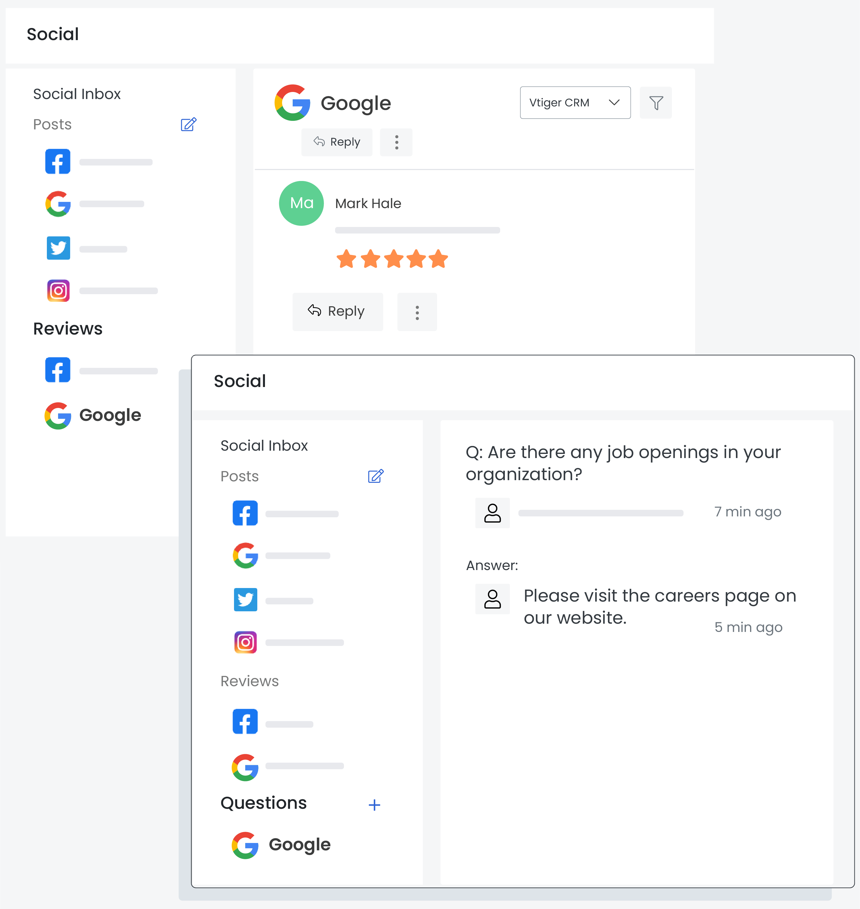 Vtiger’s Google My Business integration also allows him to create new lead records directly from the All Posts or Reviews section in the Social module. This will help him in recording leads faster and aim for fast conversions.