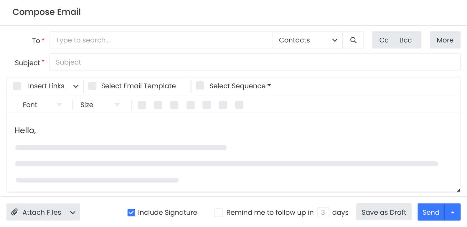 - Draft emails from multiple modules like Inbox, Email Campaigns, Contacts modules, etc., which saves your valuable time.