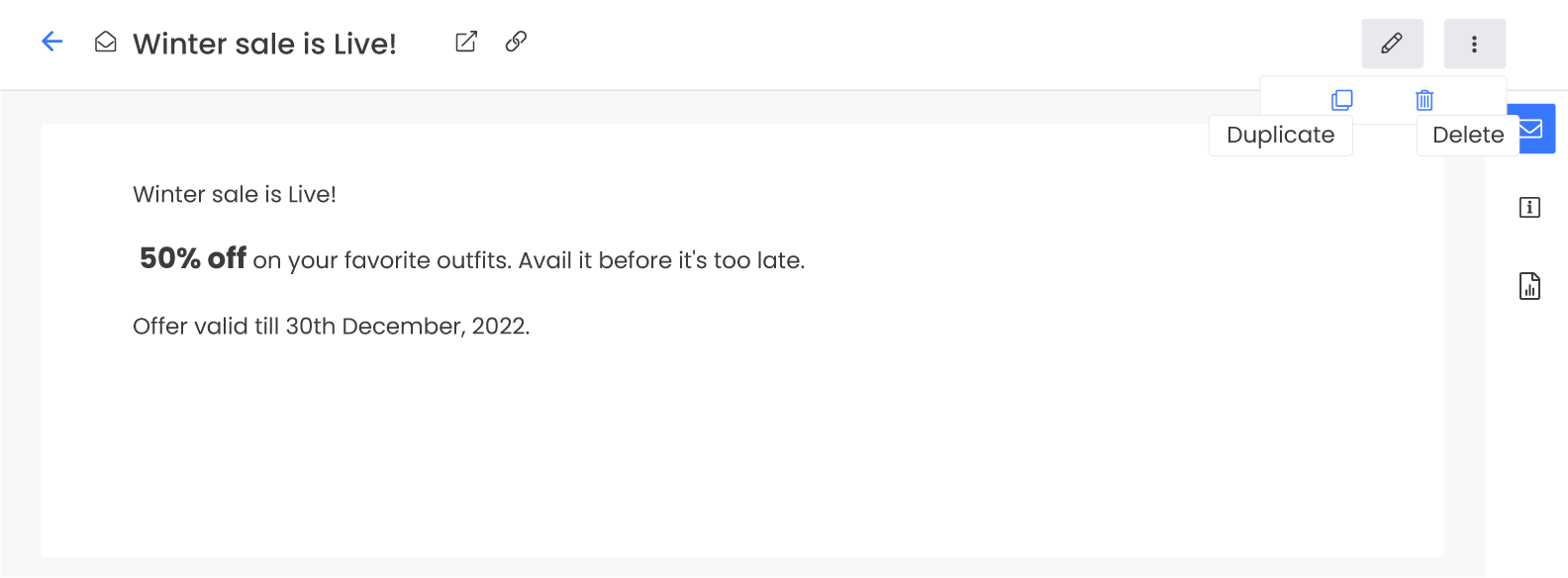 Now if you want to repurpose the existing template to send New year greetings to the same bunch of customers, you can reuse your template by duplicating it. You can make required changes like changing the subject line, description, etc. But the overall look remains the same. And finally, once the holiday season is over, you can remove the template by deleting it.