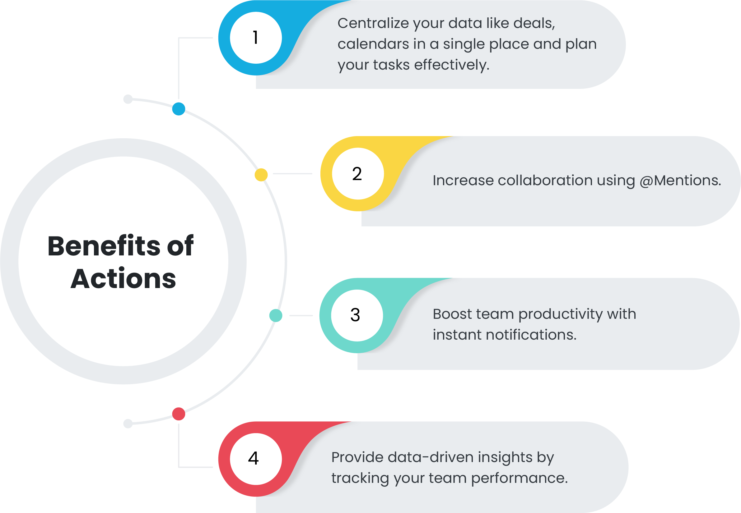 For example, if you want to discuss about a deal with your manager you can use @Mentions in the Actions module. This way your manager will receive instant notifications and will be able to revert you without delay.