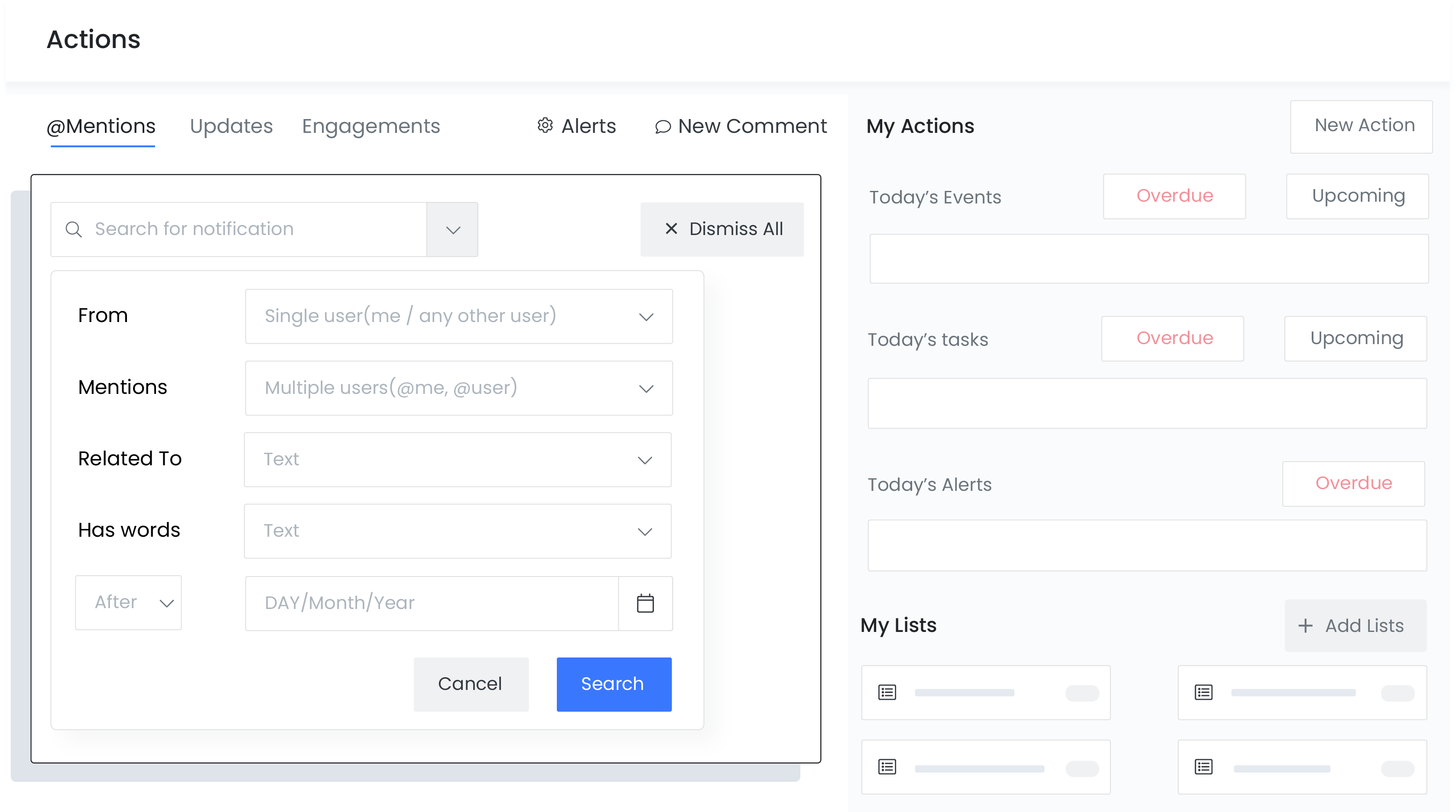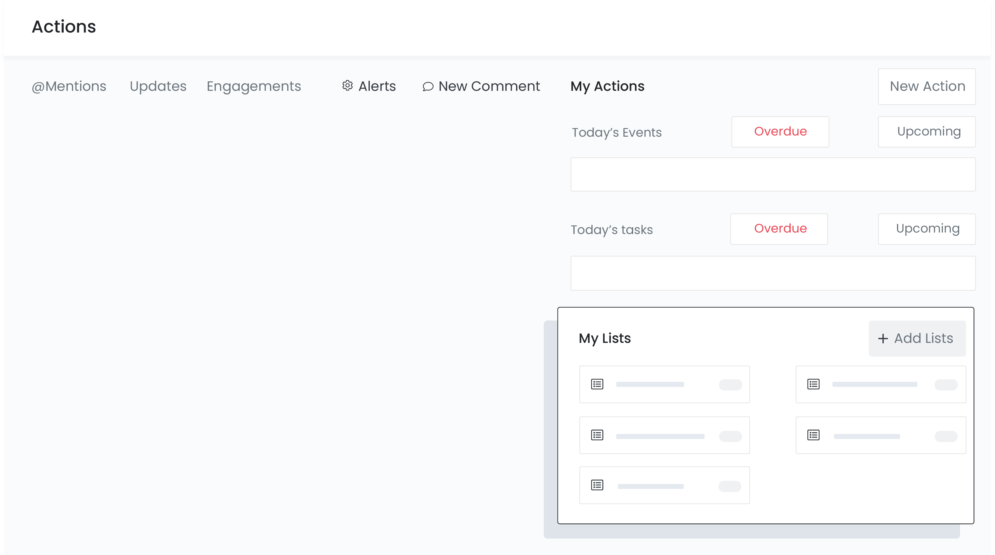 It provides details about your upcoming and overdue events, and tasks in the My Actions tab. Today’s Alert in the Actions feature displays different alerts like Smart Alerts, Engagement Alerts, etc. By using New Actions you can send an email, get on a phone call, create meetings, etc.