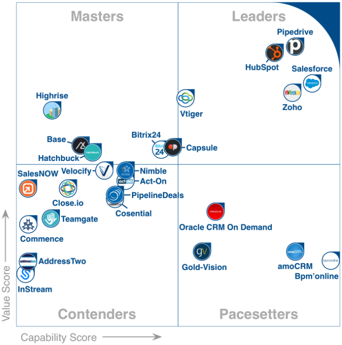 We’re proud to say that in early 2017, a Gartner company named Software Advice designated us a Leader in the CRM space alongside 5 other CRMs (see the report). They did this in large part based on an analysis of independently published reviews by verified customers, in which we were consistently praised for high value and capability. See our position below!
