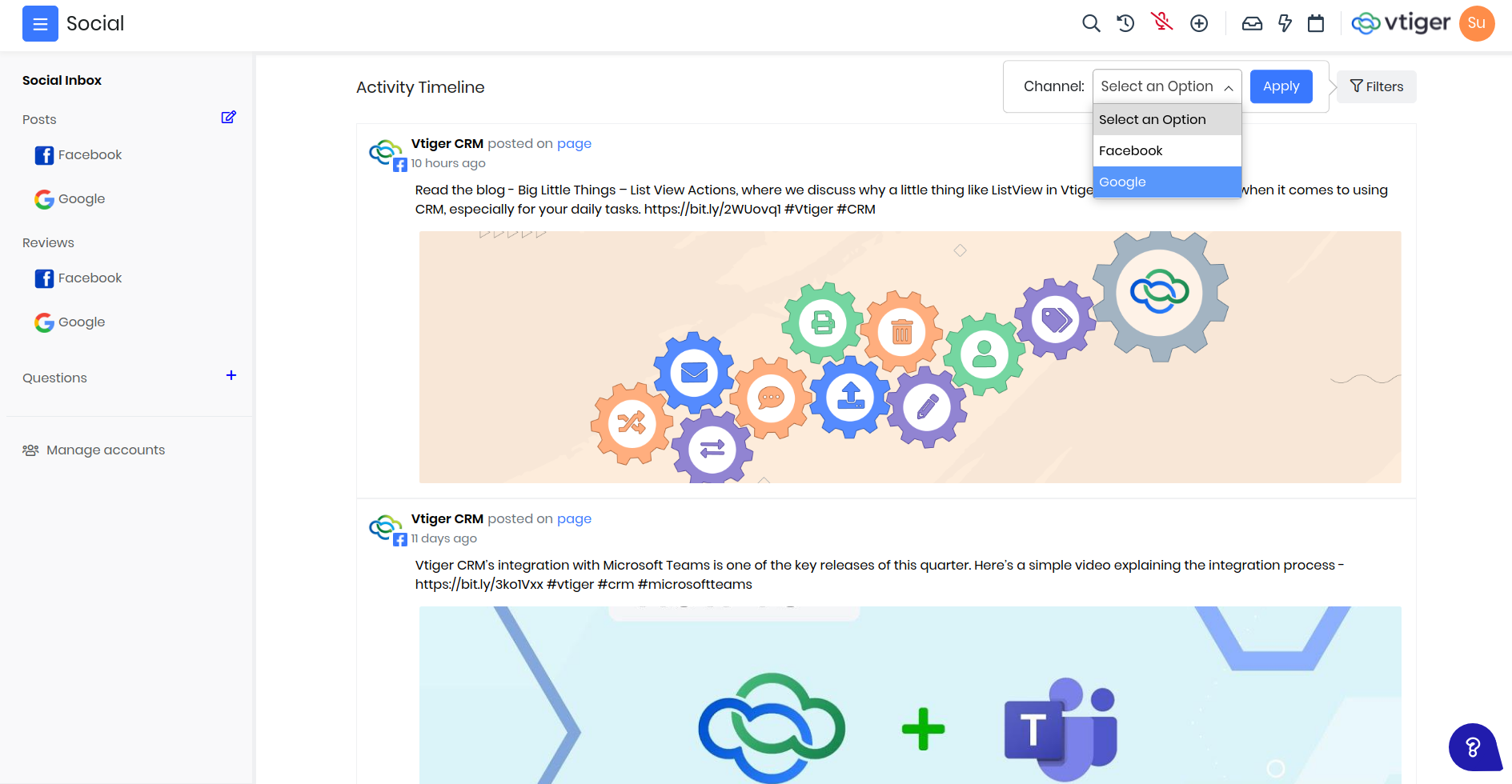 With Vtiger CRM’s new feature, the Social Module, you can do just that. The Social Module allows you to directly integrate with your Facebook, Google My Business, Twitter, and Instagram accounts. Doing so will allow you to bring your social media interactions into your Vtiger CRM.