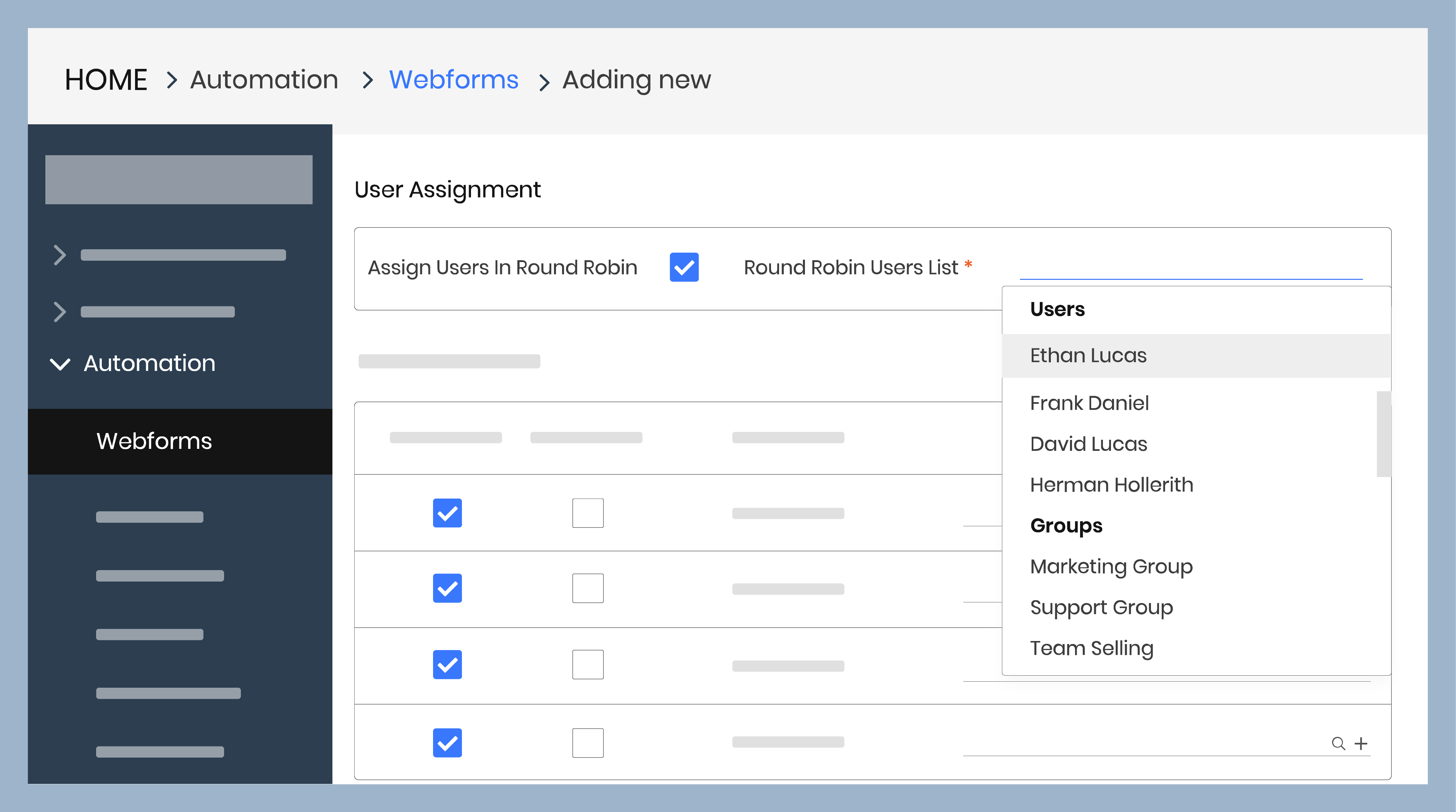 Vtiger Supports the Round-Robin method of user assignment for the webforms. Create a list of users to be assigned for a specific webform and select them from the Round-Robin users list.