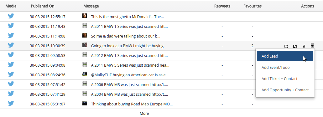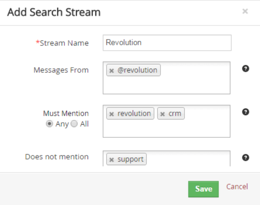 For example, the marketing team of a BMW dealership could create a stream containing tweets with keywords that indicate interest in purchasing a new car. The marketing team could then filter through those tweets and follow up directly to qualify interest, or create a lead for the sales team to follow up on.