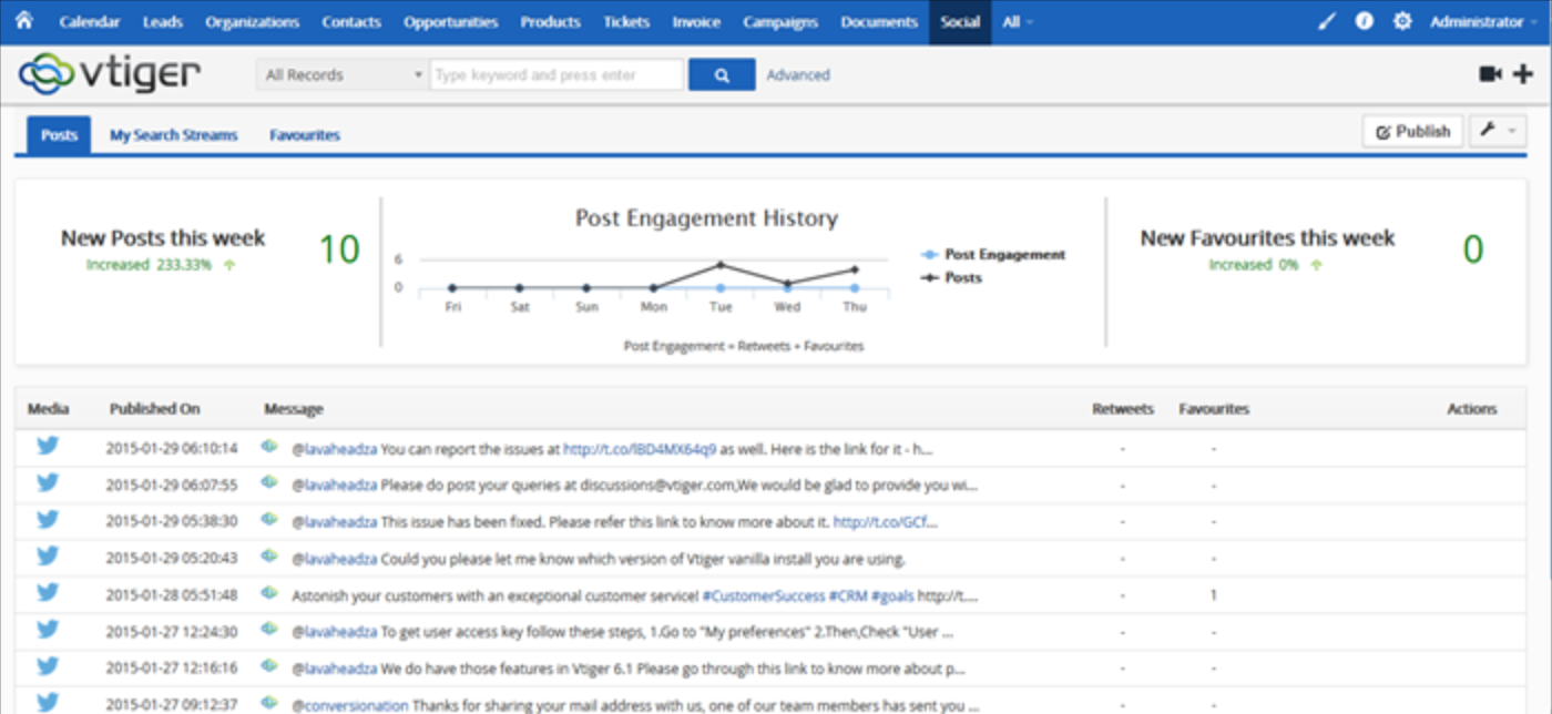Whether it’s for support, marketing or sales, Vtiger’s new social integration has tools to help organizations identify and focus on what matters, engage more quickly, and measure impact.